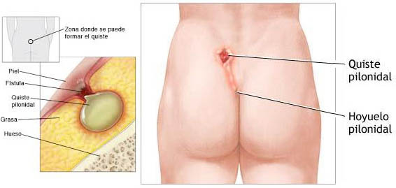 Un quiste pilonidal es una cavidad o bulto que se forma bajo la piel, generalmente en la parte superior de los glúteos, cerca del cóccix. Este quiste está compuesto por una masa de cabello, piel y otras sustancias. En algunos casos, el quiste puede infectarse, causando dolor, hinchazón y enrojecimiento. Si no se trata, puede provocar abscesos recurrentes y fístulas.